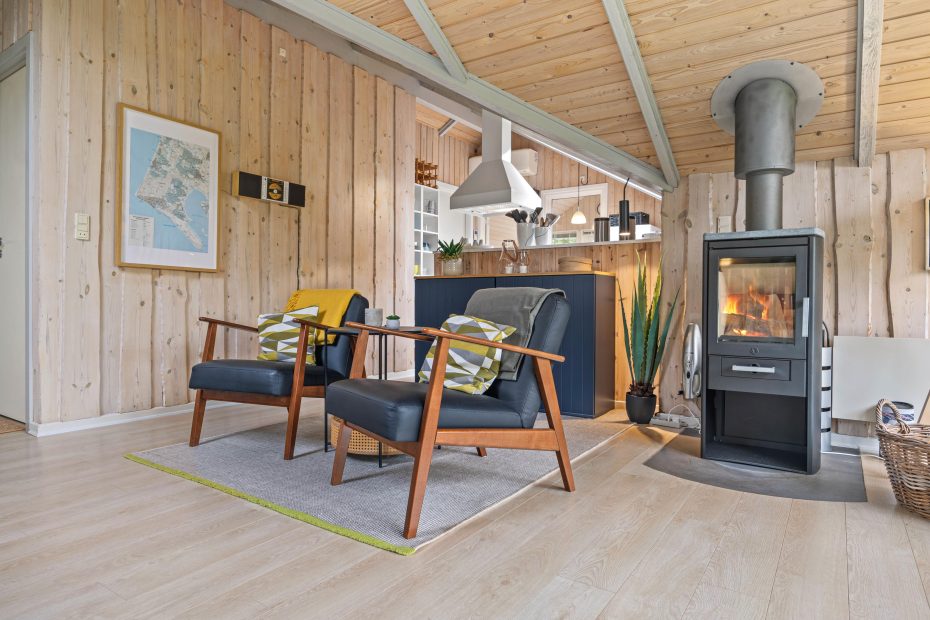 Das Herzstück dieses komfortablen Ferienhauses ist der einladende Wohnbereich, ausgestattet mit einem Fernseher, bequemen Sitzmöbeln und einem charmanten Kaminofen, der an kühleren Tagen für wohlige Wärme und eine entspannte Atmosphäre sorgt. Eine energiesparende Wärmepumpe hilft dabei, die Räumlichkeiten effizient zu heizen.