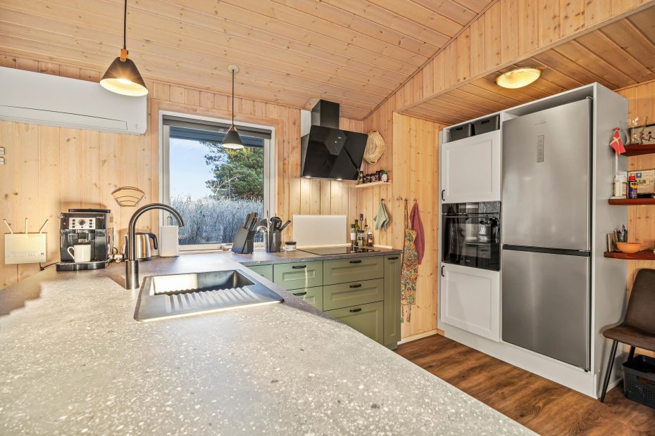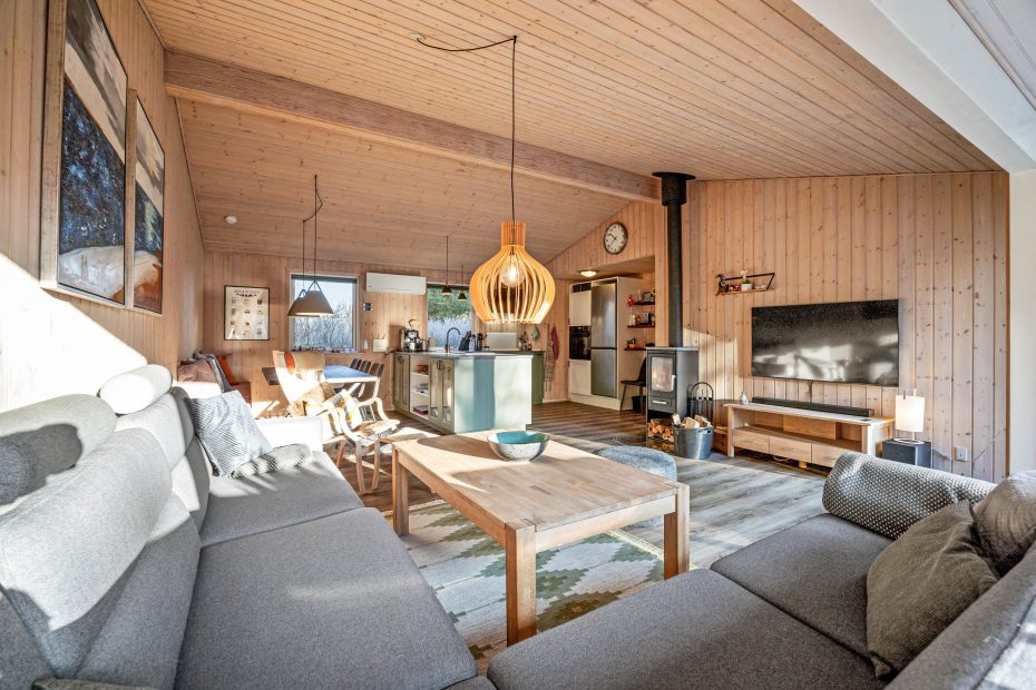 Das Wohnzimmer des Ferienhauses in Houstrup ist der perfekte Ort, um nach einem langen Tag voller Entdeckungen zu entspannen. Ausgestattet mit einem gemütlichen Kaminofen, bietet es eine einladende Atmosphäre, in der ihr entspannte Abende verbringen könnt. Die Sitzmöglichkeiten laden zum gemeinsamen Beisammensein ein, während die Parabolantenne für den TV-Empfang Unterhaltung für alle bietet. Die Küche verfügt über eine Spülmaschine, die die Arbeit erleichtert, sodass ihr mehr Zeit für Erholung habt. Der offene Küchenbereich ist ideal, um gemeinsam leckere Mahlzeiten zuzubereiten und sich über die Erlebnisse des Tages auszutauschen.