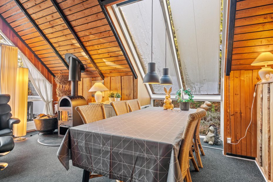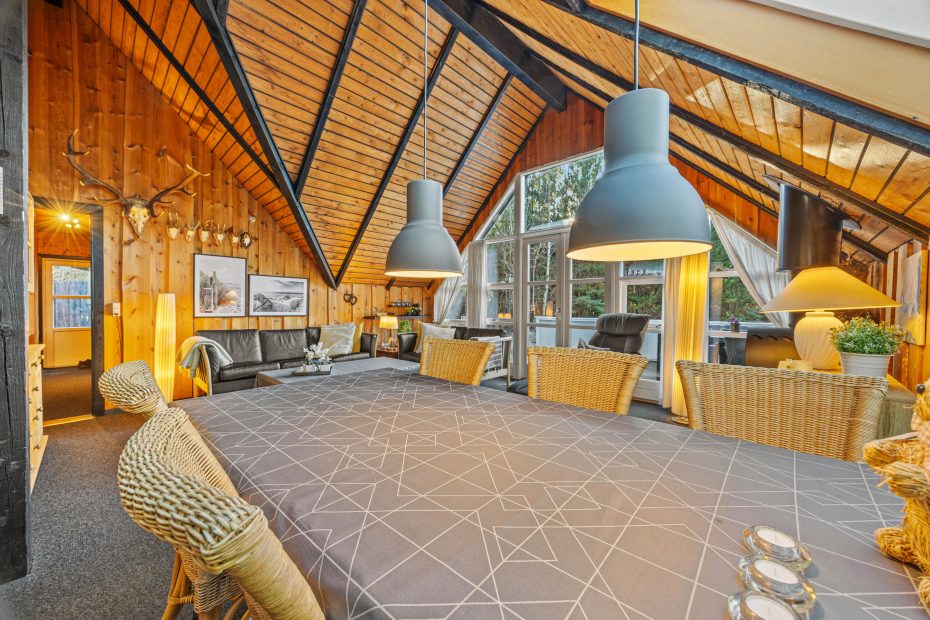 Das Herzstück dieses typisch dänischen Holzhauses mit Reetdach bildet der offene Wohn- und Essbereich, der ebenfalls den einzigartigen Hüttencharme versprüht.