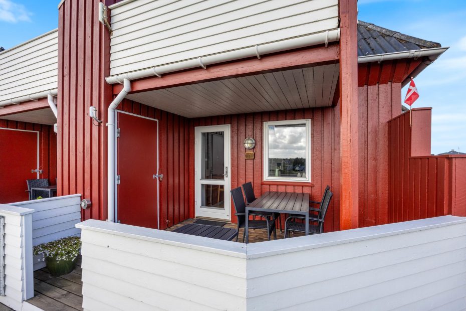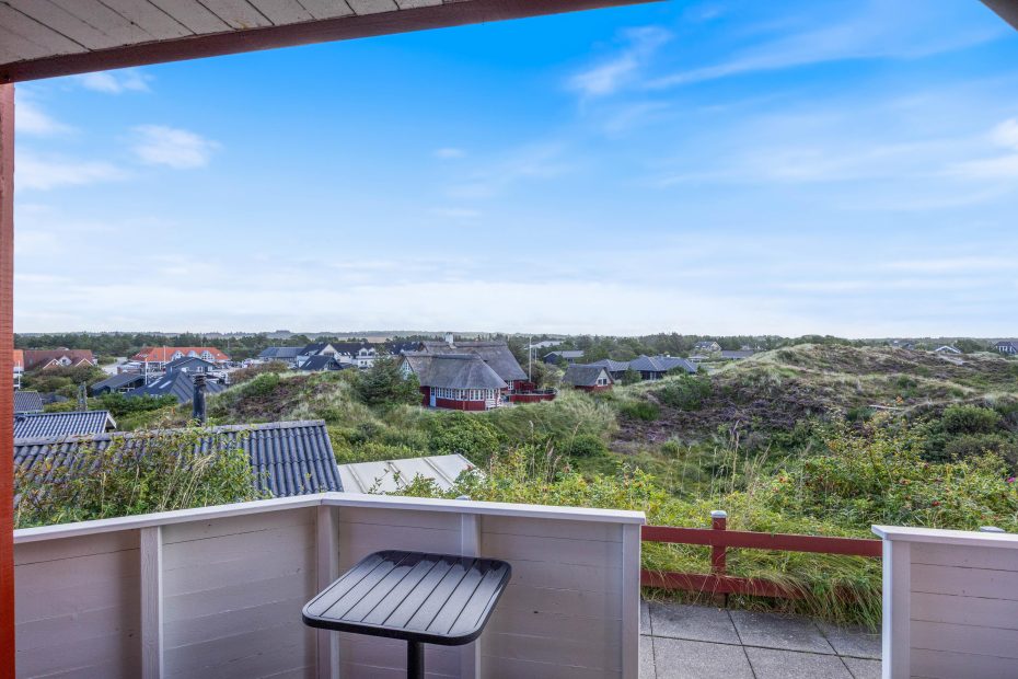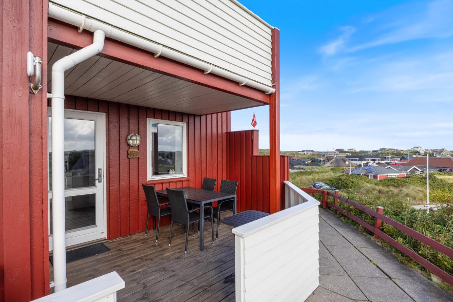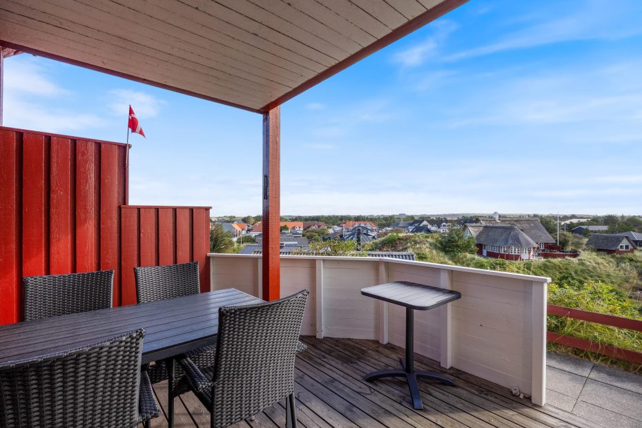 Durch die hohe Lage des Gebäudes, habt ihr von eurer überdachten Holzterrasse aus eine fantastische Aussicht über Henne Strand. Hier könnt ihr euch zum gemeinsamen Frühstück versammeln, die nächste Einkaufsmöglichkeit ist nun 200m entfernt. Über Tag könnt ihr es euch mit einem Buch gemütlich machen oder die frische Tasse Kaffee genießen, während ihr den Blick schweifen lasst. Das ist eine Wohltat für die Seele, die ihr hier einfach mal baumeln lassen könnt.