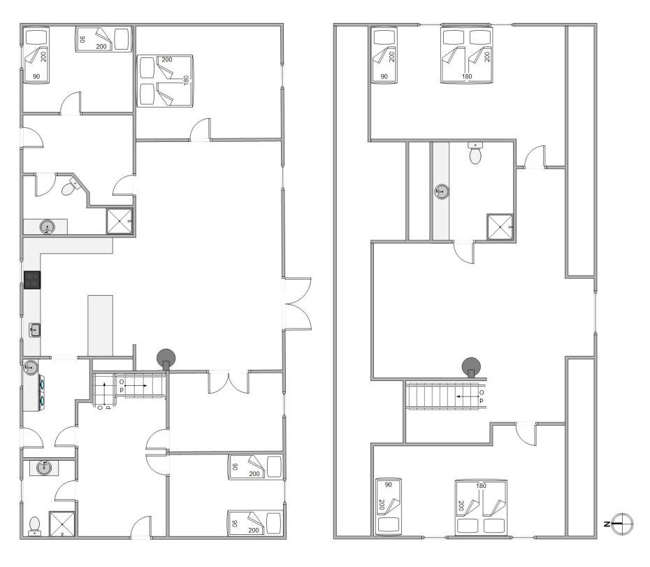 Das Ferienhaus erstreckt sich über zwei Etagen und bietet mit seinen großzügigen 240 m² genügend Platz für alle Gäste. Im oberen Stockwerk befinden sich zwei der gemütlichen Schlafzimmer sowie ein Badezimmer. Der einladende Wohnbereich ist ebenfalls hier zu finden und lädt mit einem behaglichen Kaminofen zu entspannten Abenden in geselliger Runde ein. Hier könnt ihr euch bei einem Kartenspiel oder einem spannenden Film richtig wohlfühlen.