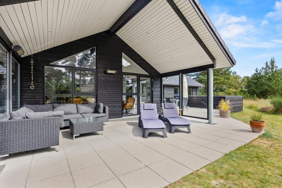Auf der großen und teilweise überdachten Terrasse lassen sich gemütliche Stunden im Freien verbringen. Hier könnt ihr es euch auf den vorhandenen Gartenmöbeln gemütlich machen. An sonnigen Tagen findet ihr ein schattiges Plätzchen unter dem Überdach – für Sonnenanbeter stehen Liegestühle zur Verfügung.