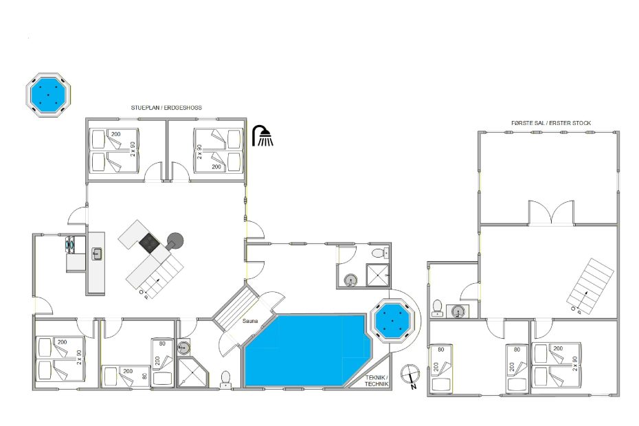 Standvandsspa, 2 Badezimmer (Fussbodenheizung), 1 Gästetoilette.