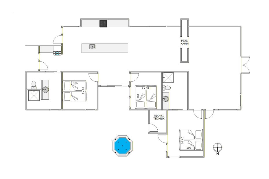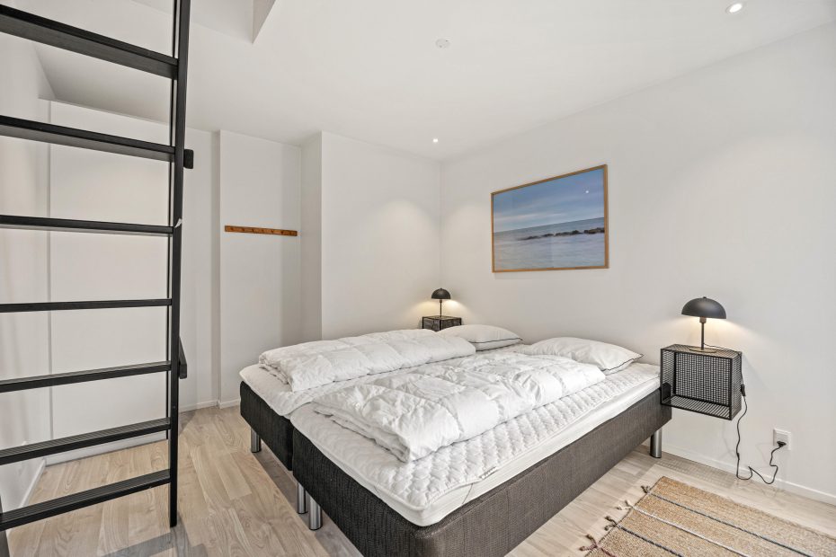 Das Ferienhaus hat 3 Schlafzimmer mit insgesamt 6 Schlafplätzen und außerdem 2 Bäder, wo wie in allen Räumen Fußbodenheizung installiert ist. Die Küche ist mit allem modernen Inventar eingerichtet, und Waschmaschine und Trockner gehören natürlich auch zur Ausstattung des Ferienhauses.