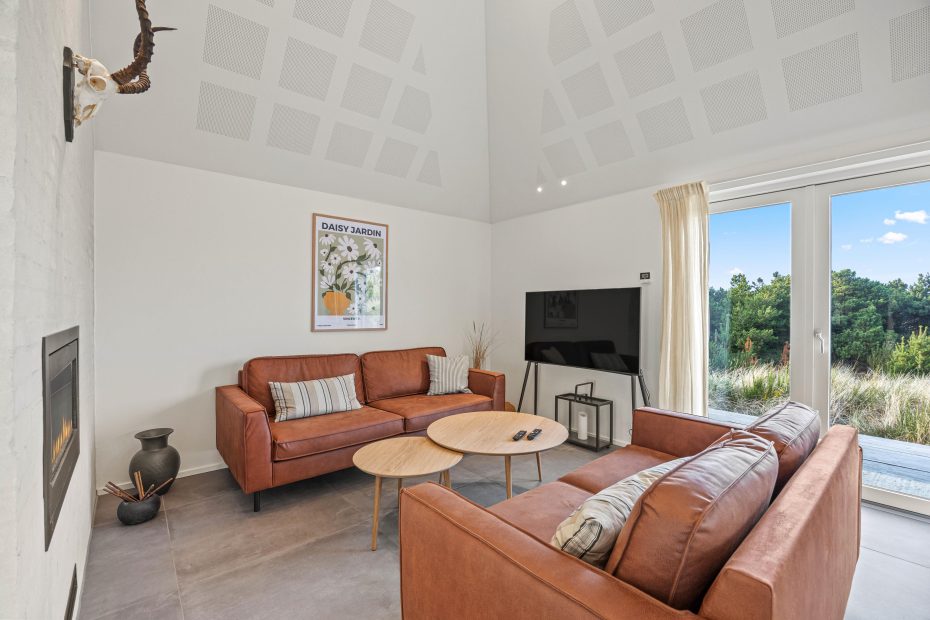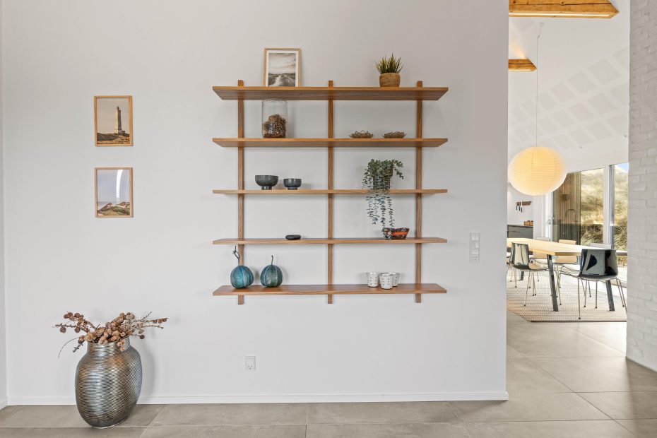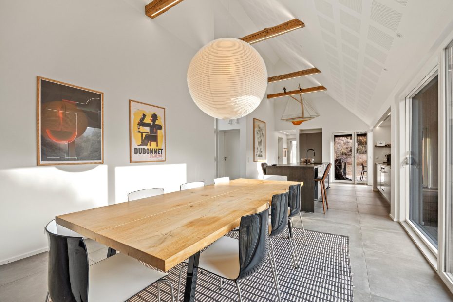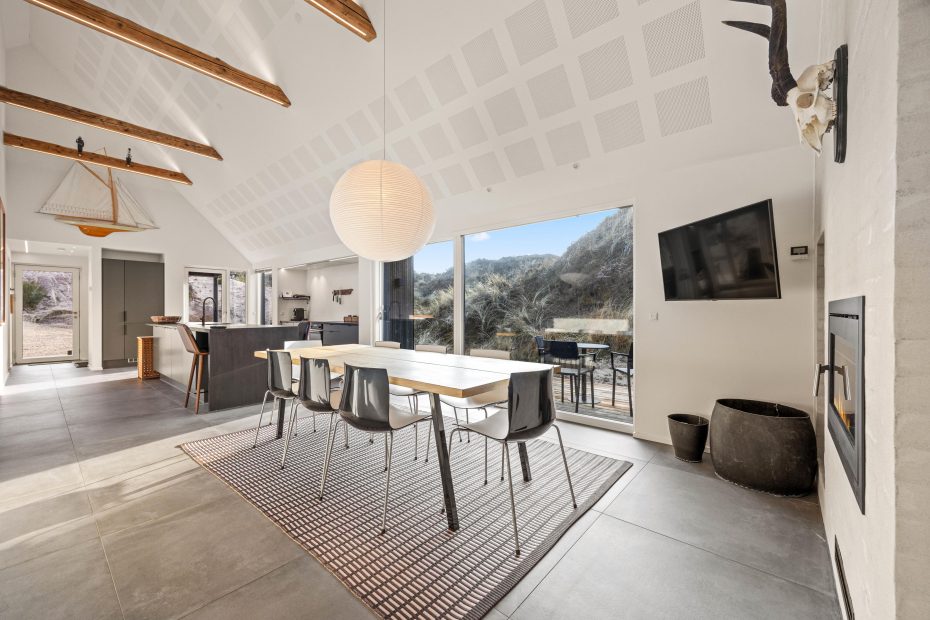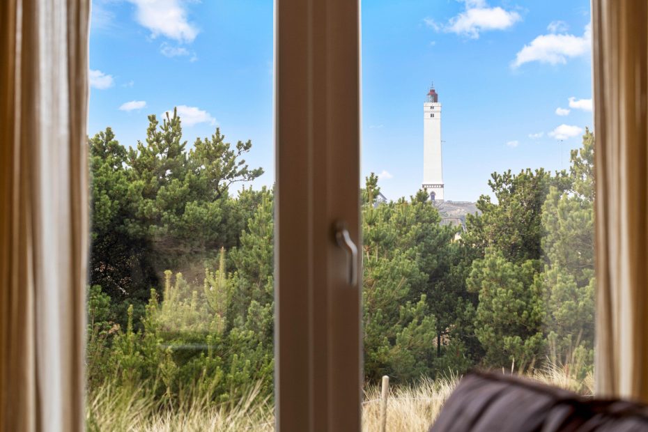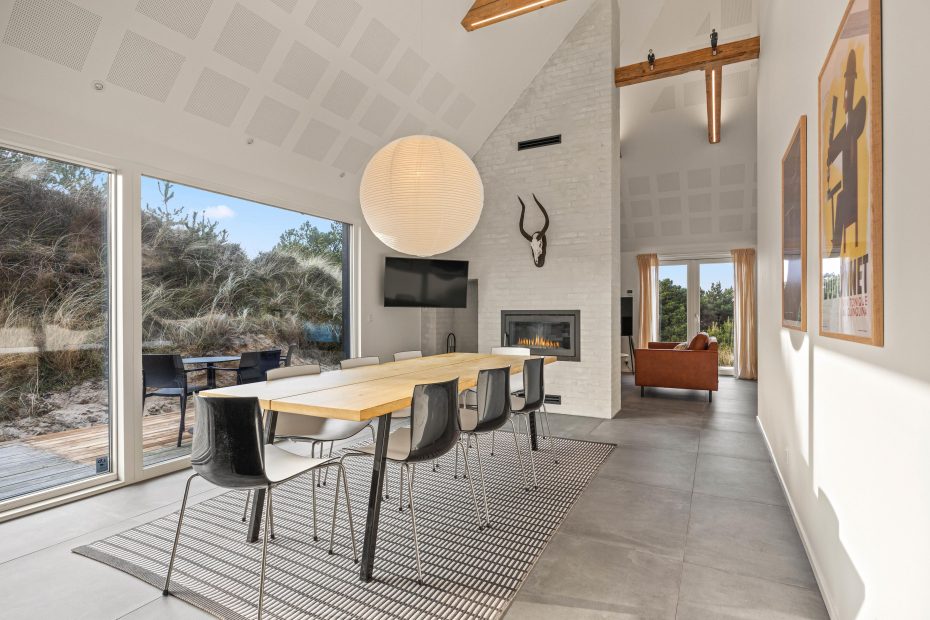 Der große Ess- und Wohnbereich ist durch eine Wand mit einem integrierten Tunnelkamin teilweise abgeteilt, welcher schon beim Abendessen für Gemütlichkeit sorgt. Die Atmosphäre des lichtdurchfluteten Hauses mit der herrlichen Aussicht auf die umliegende Dünenlandschaft und den Leuchtturm von Blåvandshuk ist einmalig. Hier könnt ihr unvergessliche Ferien verbringen.
