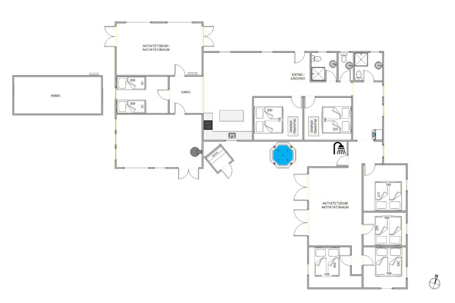 Das Ferienhaus hat 7 schöne Schlafzimmer, in denen ihr euch erholen und ausschlafen könnt. Außerdem gibt es zwei Badezimmer, sowie eine extra Gästetoilette, auf die ihr euch am Morgen aufteilt. Alle Räume haben eine Fußbodenheizung.