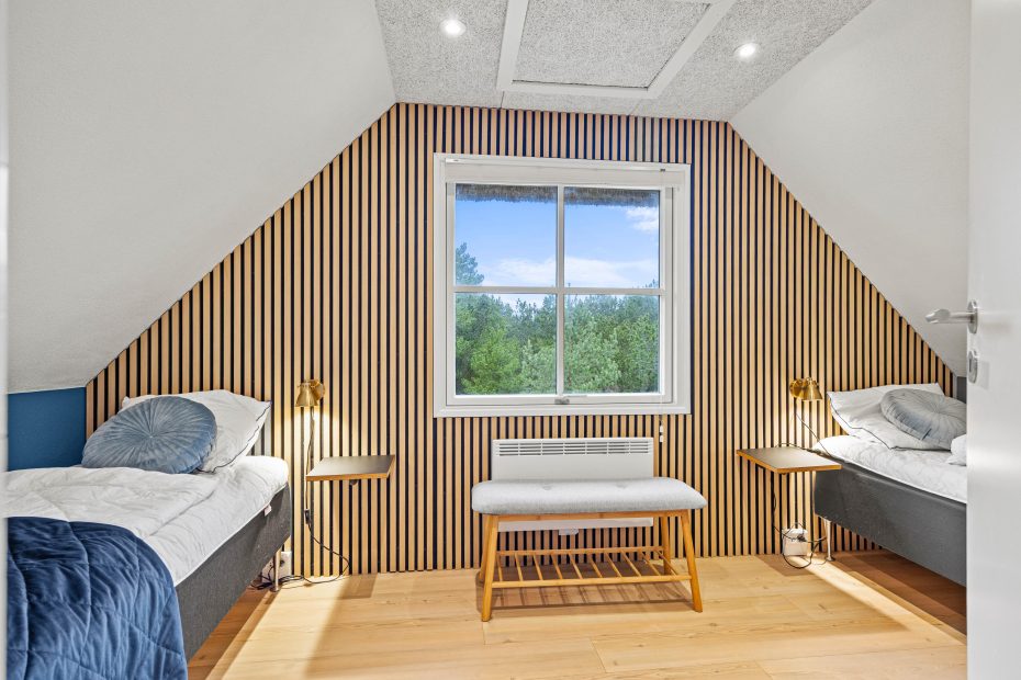 Die Raumaufteilung im Ferienhaus im Ved Skoven 4 ist perfekt für einen Urlaub mit mehreren befreundeten Paaren. Es gibt 5 schöne Schlafzimmer, die alle bis auf Eines mit zwei Einzelbetten, mit Doppelbetten ausgestattet sind. Das Haus hat zwei moderne Badezimmer verteilt auf Ober- und Erdgeschoss, beide mit Fußbodenheizung.