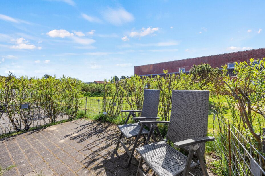 Vom gemütlichen Wohnbereich der zweistöckigen Ferienwohnung habt ihr direkten Zugang zur offenen Terrasse. Macht es euch mit einer frisch aufgebrühten Tasse Kaffee auf den Gartenmöbeln gemütlich, lest ein Buch oder löst ein Kreuzworträtsel.