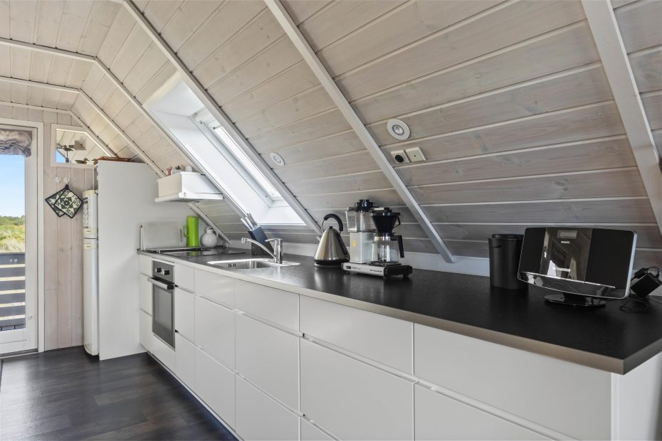Das Herzstück des Ferienhauses, das Wohnzimmer, befindet sich im oberen Stockwerk. Hier ist die moderne Küche, das Wohnzimmer und der Essbereich offen miteinander verbunden, sodass man im Wohnzimmer die Gesellschaft des anderen genießen kann. Die Urlaubsatmosphäre im Wohnbereich wird durch das Knistern des Holzofens im Hintergrund erst richtig gemütlich . Alternativ steht euch auch eine energiesparende Wärmepumpe zur Verfügung, wobei der Kamin sicherlich an den kühleren Abenden bevorzugt wird.
