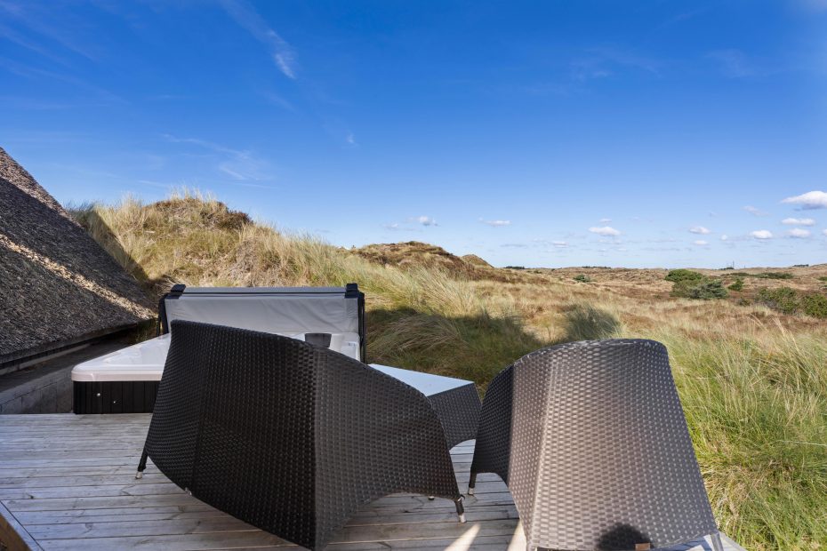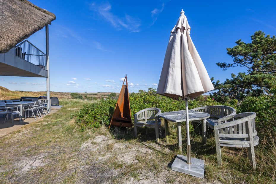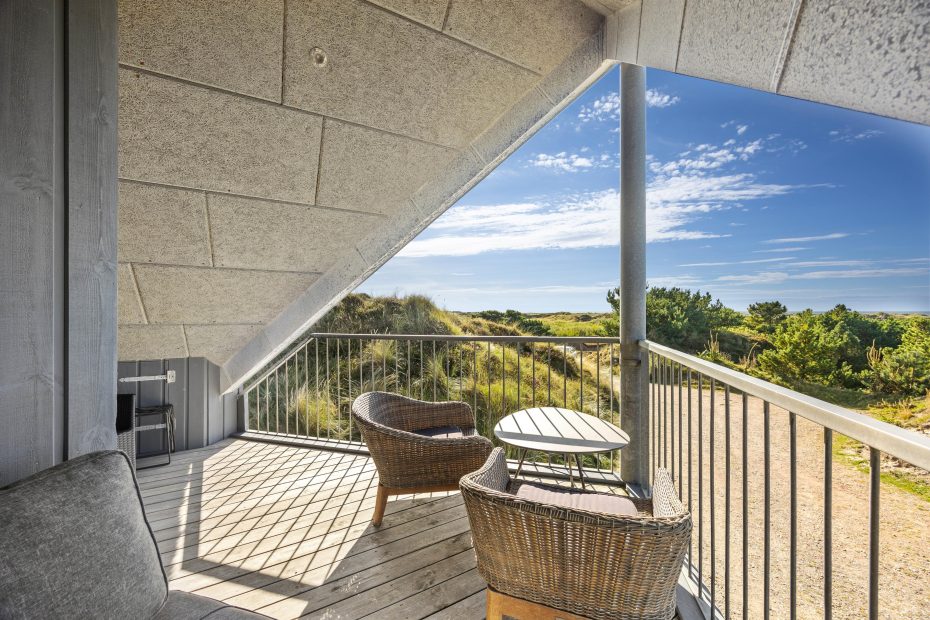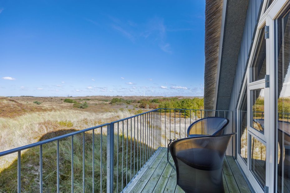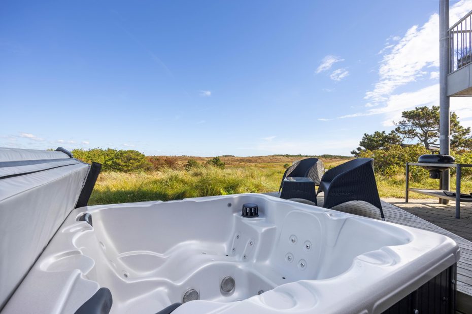 Drei Schlafzimmer sowie ein Badezimmer, welches die Sauna sowie den Whirlpool beherbergt, sind im Erdgeschoss des Ferienhauses untergebracht. Die Größe der Doppelbetten beträgt 160 x 200 cm. Beide Badezimmer des Hauses verfügen über eine Fußbodenheizung. Alle Schlafzimmer bieten Zugang zu einer Terrasse und im Obergeschoss zu einem Balkon mit herrlichem Panoramablick. Begrüßt den Tag mit einer frisch aufgebrühten Tasse Kaffee und genießt den Blick auf das Meer und die Dünenlandschaft.