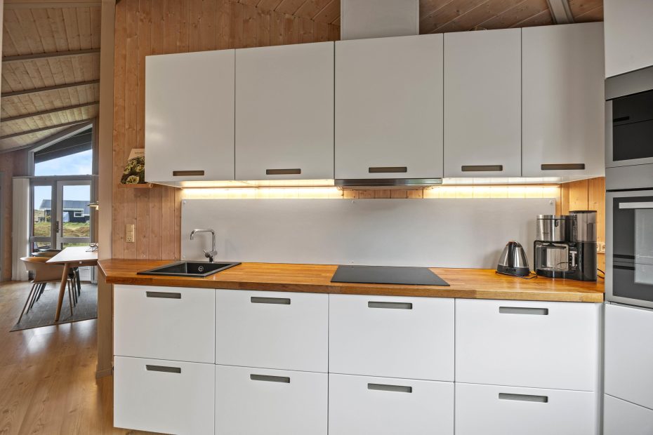 Der helle und gemütlich ausgestattete Wohnbereich, welcher sowohl einen Essbereich mit Blick nach draußen als auch eine gemütliche Sofaecke und eine an den Raum angegliederte, moderne Küche hat, bildet das Zentrum des Ferienhauses. Sowohl der Kaminofen als auch eine moderne Wärmepumpe sorgen für angenehme Temperaturen.