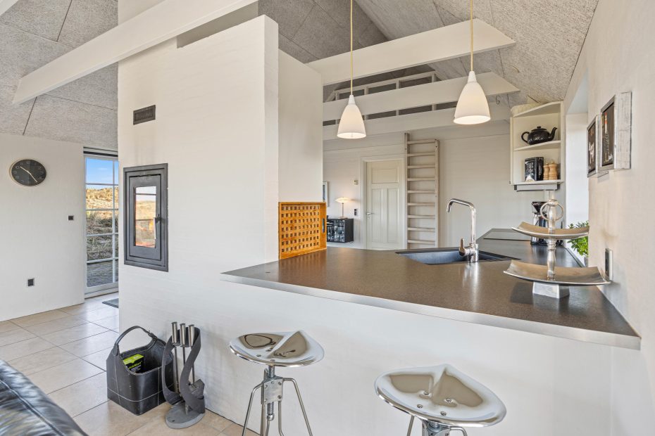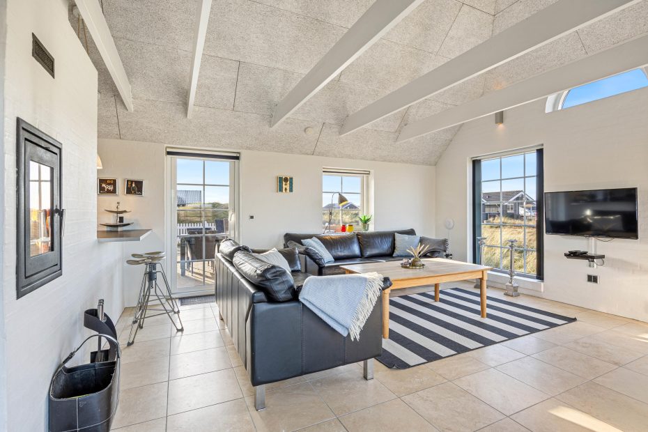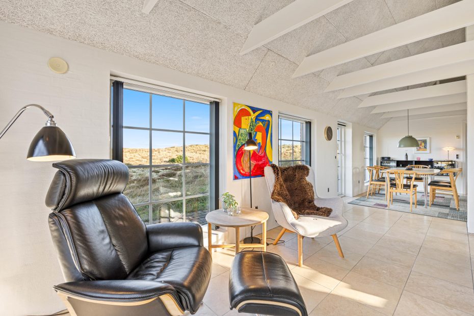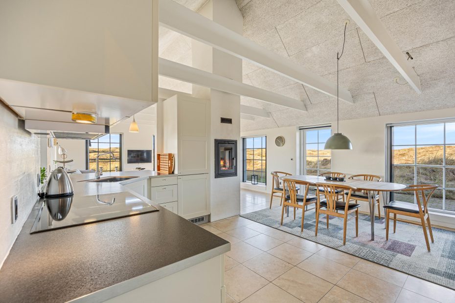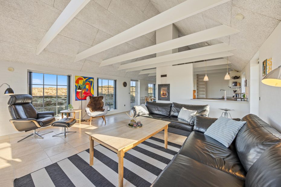 Das Ferienhaus im Arvidvej 54 schafft es moderne Ausstattung und die klassische Reetdachbauweise zu vereinen. Im Mittelpunkt des charmanten Ferienhauses steht hier der weitläufige Wohnbereich mit seinen hohen Decken und der hochwertigen Einrichtung – ein echter Wohlfühlort. Durch die großen Fenster kommt viel Licht ins Innere und ihr könnt die einmalige Panoramaaussicht auf die Heidelandschaft genießen.