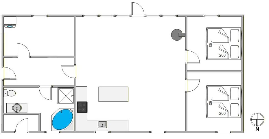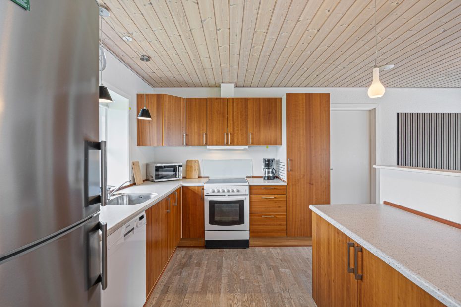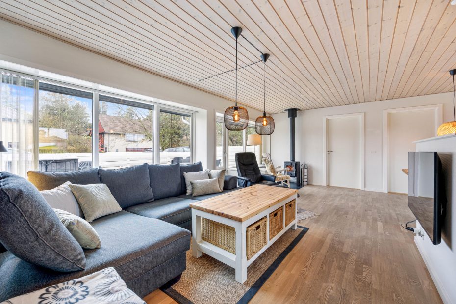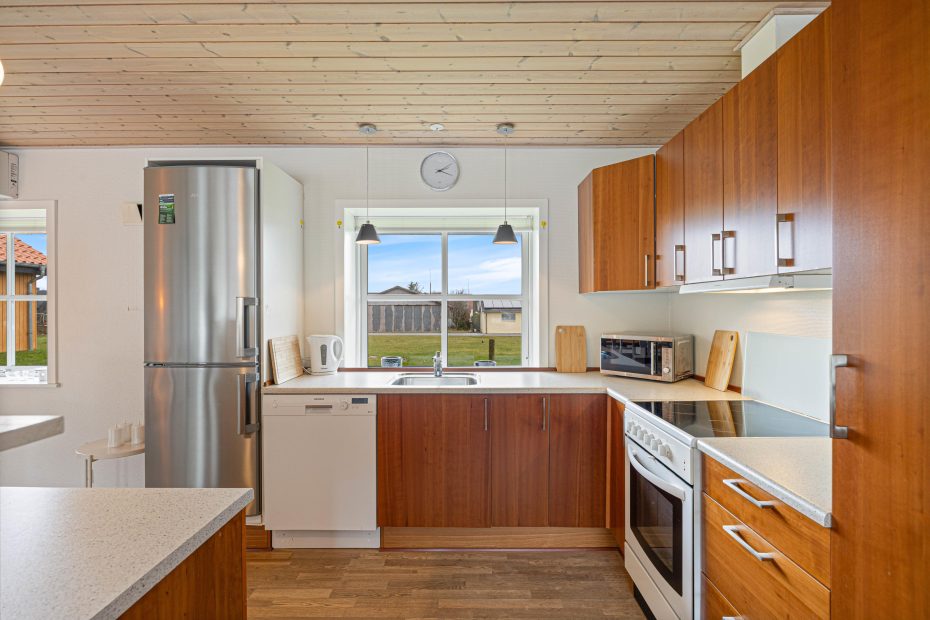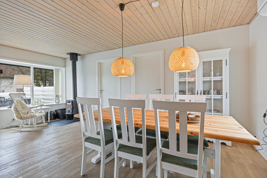 Im Inneren überzeugt das Ferienhaus durch seine durchdachte Raumaufteilung und die Ausstattung. Das Wohnzimmer lädt mit seinem Kaminofen zu gemütlichen Stunden ein – besonders an kühleren Tagen sorgt das flackernde Feuer für eine wohlige Wärme. Eine energiesparende Wärmepumpe und Fußbodenheizung ergänzen den Komfort. Die offene Küche ist mit allem ausgestattet, was du für die Zubereitung eurer Lieblingsgerichte brauchst, einschließlich einer Spülmaschine, Waschmaschine und Trockner.