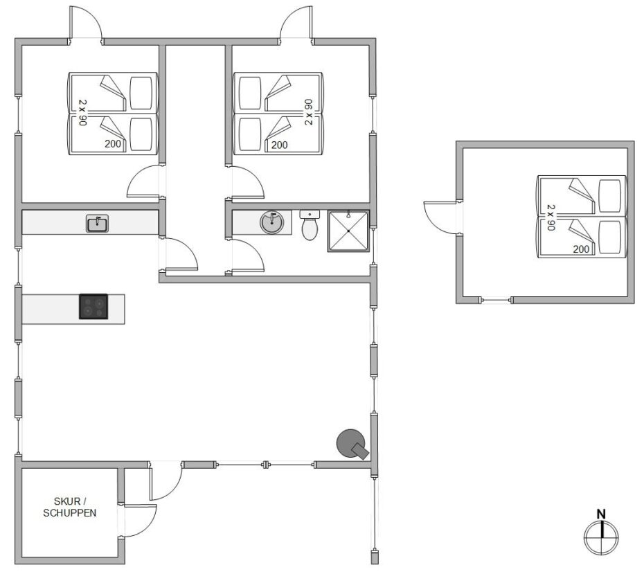 Am angrenzenden Essplatz könnt ihr gemeinsam speisen und die Mahlzeiten genießen. Das einfache Tageslichtbad ist mit Dusche und Fußbodenheizung ausgestattet. Eine Waschmaschine und ein Trockner stehen euch ebenfalls im Ferienhaus zur Verfügung. Drei Schlafzimmer mit jeweils einem Doppelbett, eines davon im Anbau, bieten euch erholsamen Schlaf nach einem ereignisreichen Tag.