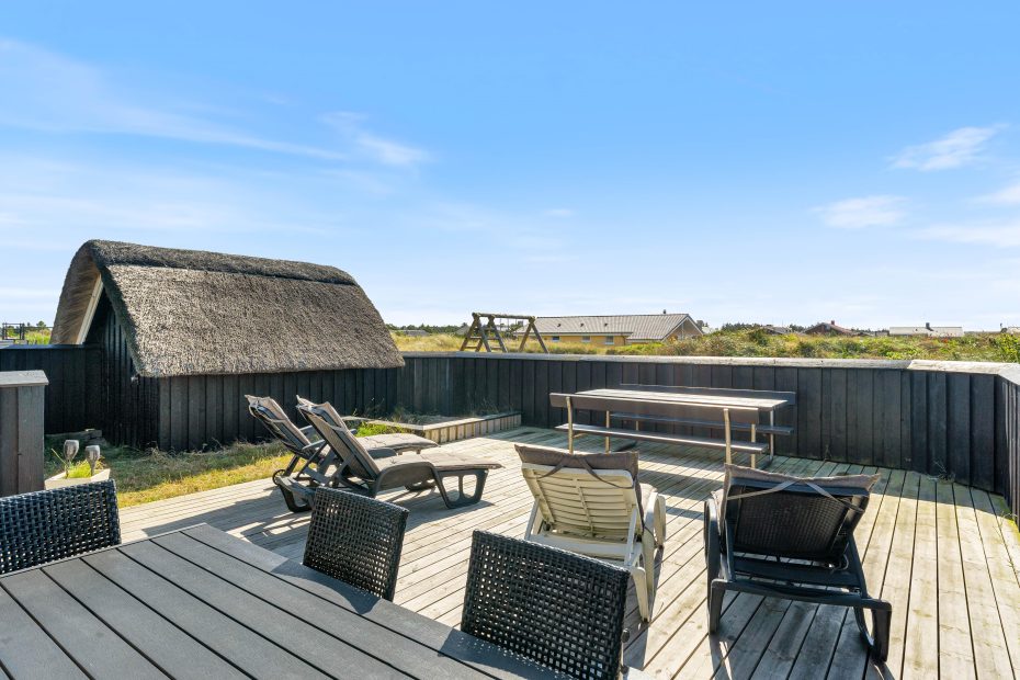 Das Ferienhaus steht auf einem hügeligen Naturgrundstück und hat eine wunderschöne Holzterrasse, die mit Gartenmöbeln, Liegestühlen und einem Grill ausgestattet ist. Hier könnt ihr einen leckeren Grillabend mit der gesamten Familie verbringen.