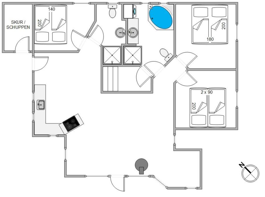 Schönes Ferienhaus mit guter Ausstattung. Rollos an den Fenstern/Terassentür (ausser an der Eingangstür). Liegt am Ender einer Sackkasse und hat somit keinen Durchgangsverkehr. Für Hunde ideal durch den kleinen eingezäunte Rasenteil direkt an der geschlossenen Terasse (da kann man den Hund schnell mal Nachts rauslassen, ohne erst anzuleinen und was anzuziehen). Sauna/Whirlwanne/Kamin haben nicht genutzt. Die geschlossene Terasse ist gross und man findet immer einen Windgeschützten Platz. Das Haus ist schön hell (wenn die Sonne scheint, blendet es auf dem TV, trotz Rollos). Die Betten sind sehr gut. Der Fussboden im Wohnzimmer knarrt etwas. Die zwei Bäder sind schön und gross genug. Zwei Schlafzimmer mit Doppelbetten (180x200cm) und ein Schlafzimmer (140x200cm), also für 5 Personen sehr angenem (wir waren 4 Personen). Terassenmöbel/Liegen/Fahrräder/Grill/Dart… alles da.