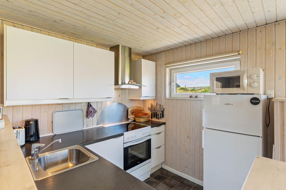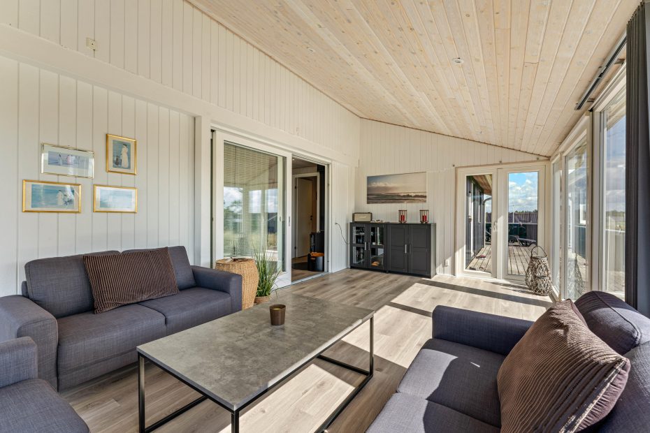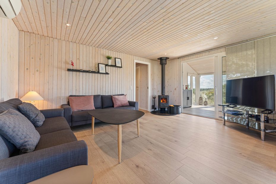 Im Herzen des Ferienhauses befindet sich der großzügige Wohnbereich mit Essplatz, offener Küche und Zugang zum schönen Wintergarten. Ein wunderbarer Ort zum Entspannen, selbst wenn der dänische Sommer mal ein wenig launisch ist. Abends könnt ihr euch nach einem spannenden Urlaubstag mit der ganzen Familie vor dem Fernseher Flachbild 55″ versammeln und euren Lieblingsfilm schauen, während der Holzofen im Hintergrund knistert.