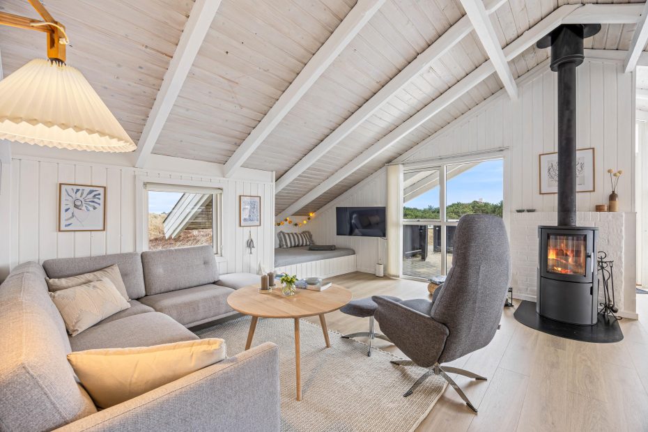 Das Ferienhaus wurde 1979 erbaut und eignet sich für Urlaubstage mit Familie oder Freunden. Auch euer Hund ist willkommen. Im Wohnbereich sorgen helle Holzwände, sichtbare Balken und große Fenster für ein angenehmes Raumgefühl und einen Blick auf die Terrasse. Ein Alkoven bietet den Kindern die Möglichkeit zum Spielen oder Ausruhen. An kühleren Tagen schafft der Kamin wohlige Wärme und eine gemütliche Atmosphäre.