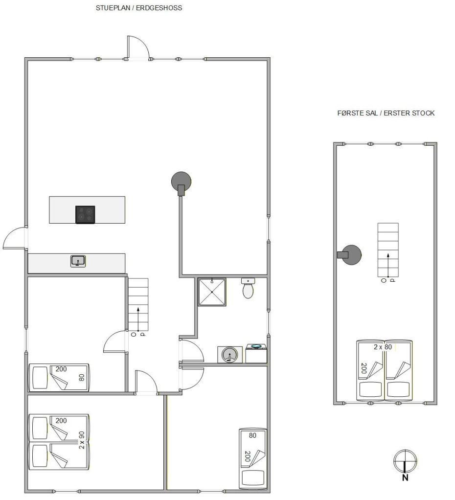 Nach aufregenden Urlaubstagen sorgen die drei Schlafzimmer mit einem Doppelbett und zwei Einzelbetten für entspannten Schlaf in der Nacht und am Morgen kann man von den hinteren Schlafzimmern den freien Blick in die Heide- und Dünenlandschaft genießen. Im geräumigen Obergeschoss befinden sich ein weiteres Doppelbett und ein eigener Lese- und Fernsehbereich, in den man sich bequem zurückziehen kann.