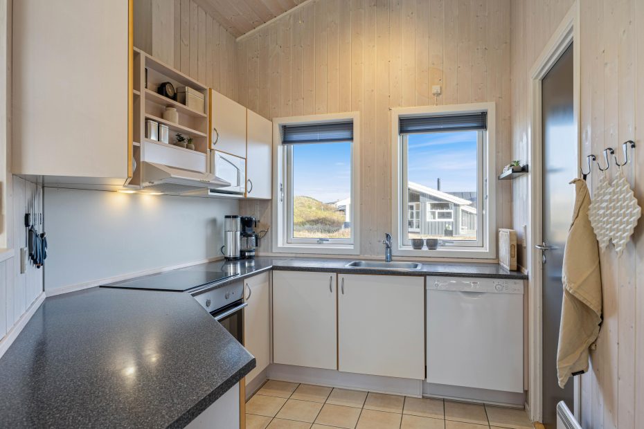Die Küche und das Wohnzimmer sind miteinander verbunden und die großen Fenster machen den Raum noch offener und bieten Ausblick auf die wunderschöne Dünenlandschaft. Der Holzofen garantiert das ganze Jahr über eine wohlige und gemütliche Atmosphäre.