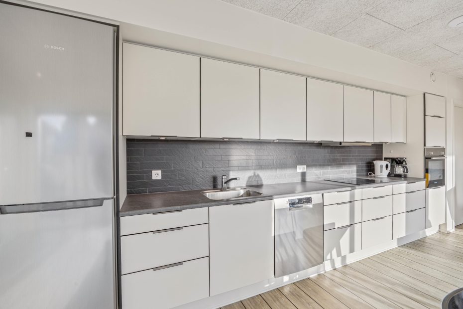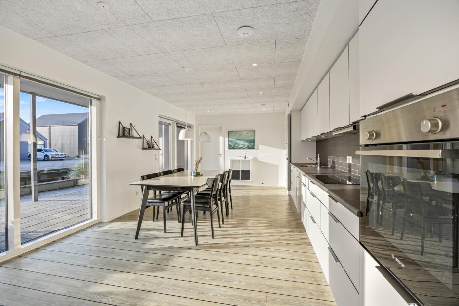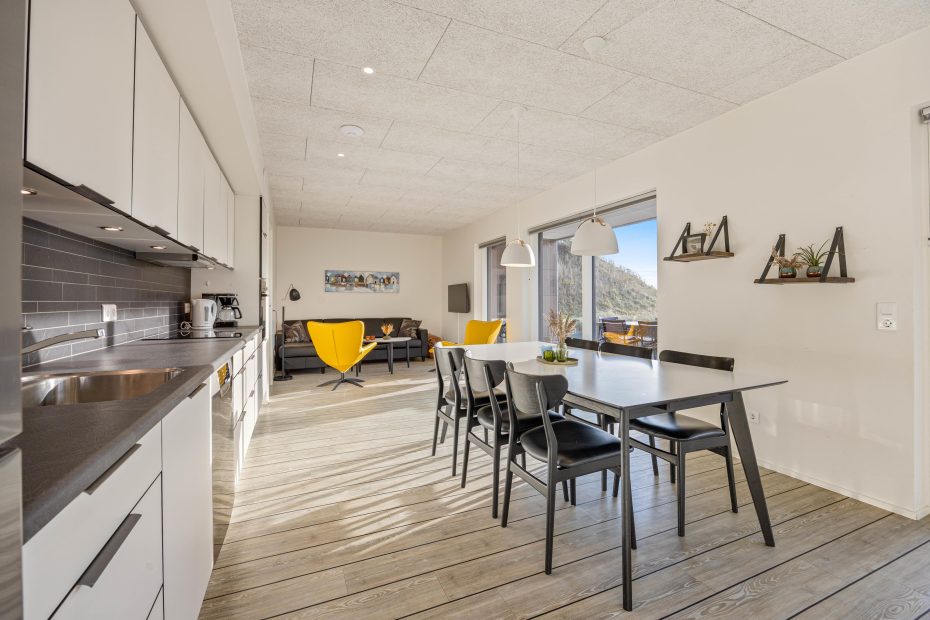 Durch den Flur hindurch kommt ihr zu dem hellen Wohn- und Essbereich mit offener Küche an dem sich die breite Terrasse anschließt. Im Wohnzimmer könnt ihr es euch nach einem langen Spaziergang am Fjord auf dem Sofa vor dem Flachbildfernseher bequem machen und die Fußbodenheizung sorgt für eine Wohlfühltemperatur. Bitte beachtet, dass die Auswahl an deutschen Fernsehprogrammen beschränkt ist.