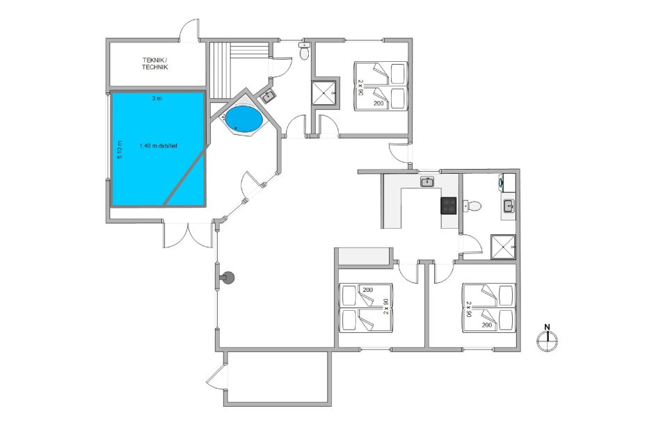 Dieses Ferienhaus bietet 6 Schlafplätze auf 3 Schlafzimmer verteilt. Es verfügt über 2 Badezimmer, beide mit Duschkabine und Fußbodenheizung. Ein Badezimmer wurde 2010 neu renoviert und dort stehen Waschmaschine und Trockner zur Verfügung. Das andere Badezimmer ist mit einer Sauna versehen. Die Küche befindet sich Mitten im Haus und ist u.a. mit 40-l Gefrierschrank, Mikrowelle und Geschirrspüler ausgestattet. Der Swimmingpool wurde mit einer Luft-zu-Wasser Wärmepumpe ausgestattet und kann daher energiesparend aufgewärmt werden.