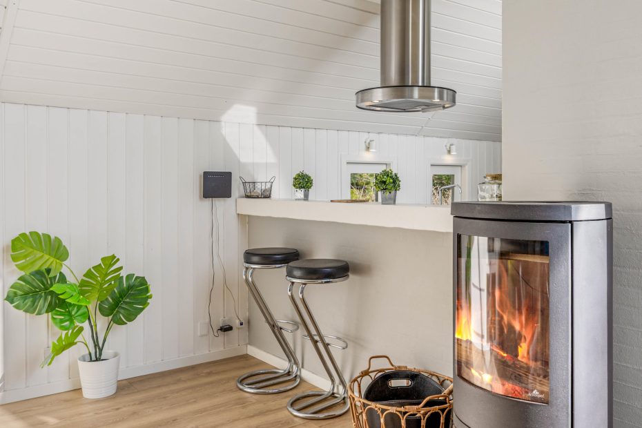 Gemütliche Einrichtung mit Holzofen und praktischer Ausstattung