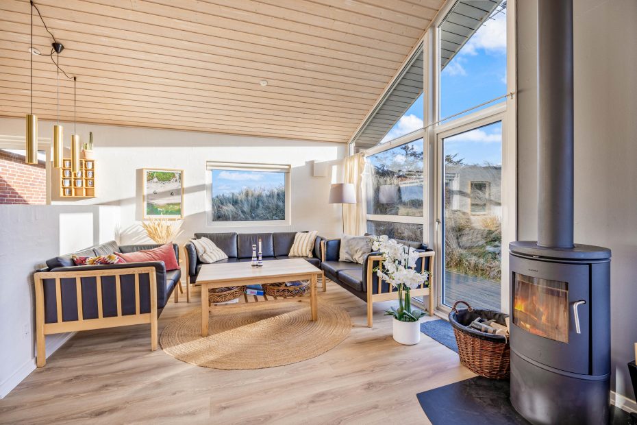 Der Wohnbereich ist offen gestaltet und durch die großen Fenster kommt viel natürliches Tageslicht in das Ferienhaus hinein. Neben dem Kamin steht ein Tagesbett für euch bereit – macht es euch hier z.B mit einem Buch in der Hand gemütlich, lauscht dem Knistern des Kamins und genießt die Aussicht.