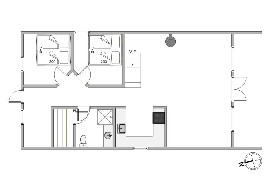 Der gemütliche Wohnbereich hat fisthohe Decken und ist mit der gut ausgestatteten Küche offen verbunden. Und in dem Wohnzimmer sorgt der Kaminofen für Wärme und gemütliche Stimmung. Darüber hinaus hat das Ferienhaus auch freies Internet mit WLAN, Flachbildschirm mit dänischen sowie deutschen Programmen, 2 schöne Doppelschlafzimmer mit Federkernmatratzen und Schränken sowie einen Hängeboden mit zwei Betten.
