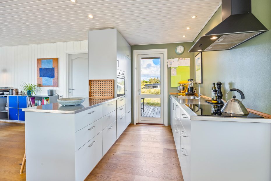 Die offene Küche ist mit dem Wohnzimmer verbunden und bildet somit einen schönen großen Raum, wo sich die ganze Familie zum Beispiel zum fernsehen oder Spiele spielen sammeln kann. Dabei kann der Kamin angezündet werden, der für eine kuschelige Atmosphäre sorgen kann.