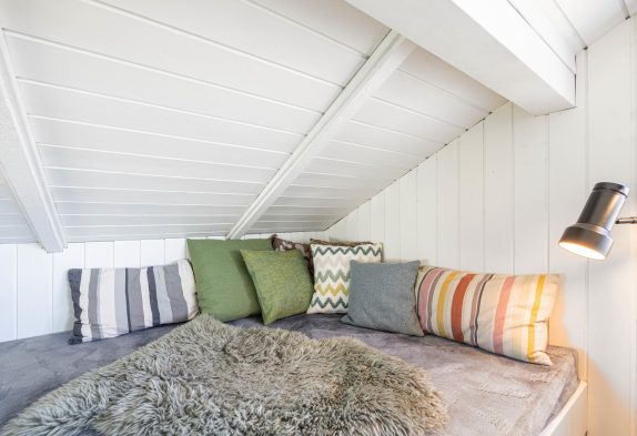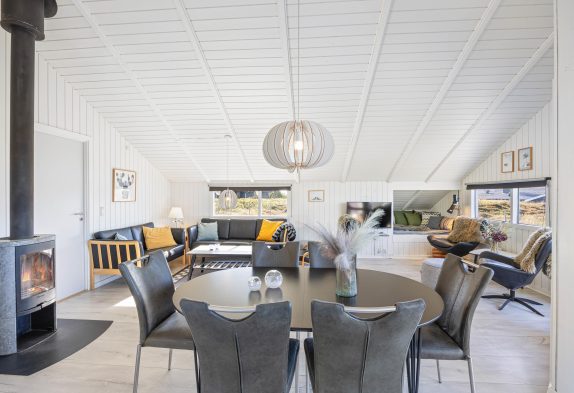 Es gibt hohe Decken und der großzügige Wohnbereich lädt zu Geselligkeit und Entspannung vor dem Fernseher ein. An kalten Tagen könnt ihr immer noch die schöne Landschaft durch das große Fenster genießen, während euch die knisternden Flammen des Holzofens wärmen, obwohl Draußen der Wind pfeift und nochmal richtig aufdteht.