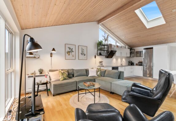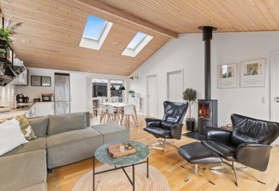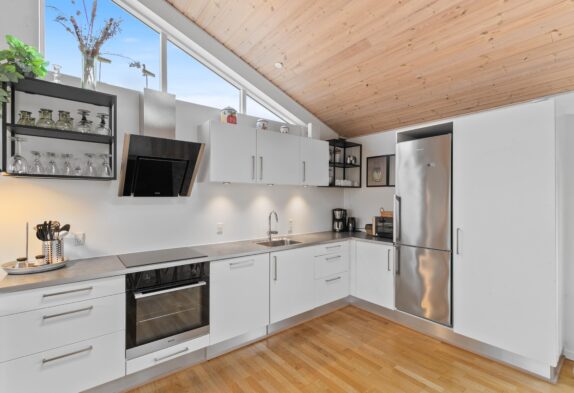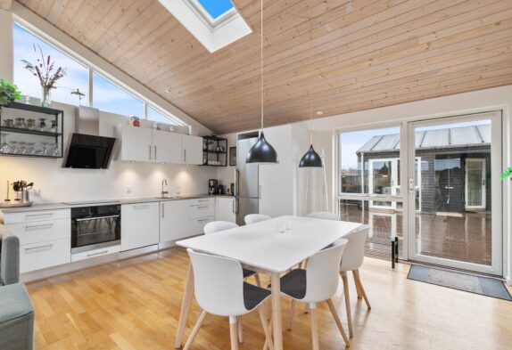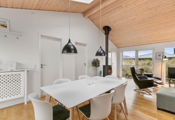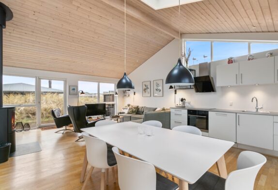 Das Licht ist ein wichtiger Faktor im Ferienhaus. Die Kombination aus der großen Fensterfront und den hellen Wänden und Decken schafft eine ruhige und helle Atmospäre im Haus, die zum Entspannen einlädt. Die schicke Küche liegt offen integriert im Wohn-/Essraum, so dass hier der ideale Sammelpunkt für die ganze Familie ist. Macht gemeinsam Pläne für den nächsten herrlichen Urlaubstag und trefft euch am Abend zum spannenden Spieleabend. Das spannende Buch liest sich vor dem knisternen Kamin umso besser und die vollkommende Entspannung findet ihr im Whirlpool und in der Sauna. Der Anbau mit eigenem Bad und Schlafzimmer ist ideal, wenn Teenager mit dabei sind, die auch mal „ihre Ruhe“ haben wollen.