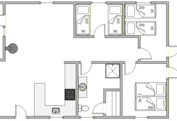 Im Zentrum des Hauses stehen klare Linien, natürliche Materialien und eine durchdachte Raumaufteilung. Drei Schlafzimmer – ein geräumiges Zimmer mit Doppelbett und zwei kleinere mit je zwei Einzelbetten – bieten Platz für erholsamen Schlaf. In einem der Schlafzimmer befindet sich der Zugang zum Hochboden.