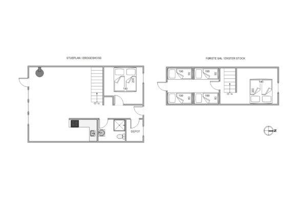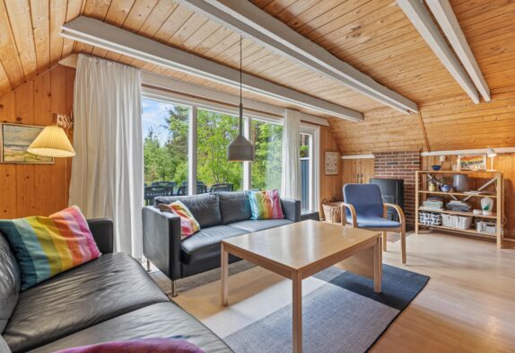 Im Ferienhaus können bis zu 6 Personen wohnen und schlafen. Es gibt 3 Schlafzimmer, eines im Erdgeschoss mit Doppelbett und zwei im Obergeschoss mit schrägen Wänden. Eines mit Doppelbett, das andere mit Einzelbetten (80×190 cm) und Zugang zum kleinen Balkon. Das helle Badezimmer ist mit WC, Duschnische und kleinem Schrank praktisch für jeden Ferienhausaufenthalt ausgestattet.