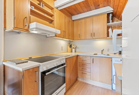 Die Küche ist nicht sehr gross, aber mit allem Notwendigem ausgestattet. So gibt es neben Kaffeemaschine und Wasserkocher einen Kühlschrank mit Gefrierfach und eine Geschirrspülmaschine.
