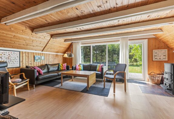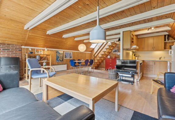 Der offene Wohnbereich des Hauses ist kombiniert aus Küche, Essbereich und Wohnzimmer. Alles ist sehr einladend und freundlich. Die schicke Sofagruppe vor dem TV am Kamin lädt zu gemütlichen Stunden ein. Hier kann bei Musik ein gutes Buch gelesen oder ein warmer Kakao bei einem spannenden Film auf dem Flachbild-TV genossen werden. Die sichtbaren Dachbalken, die sich vom hellen Holz gut absetzen, verleihen dem Wohnraum einen ganz besonderes Charme.