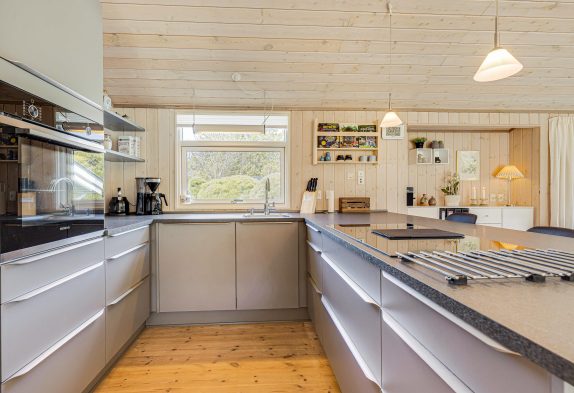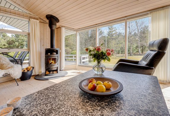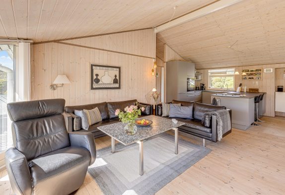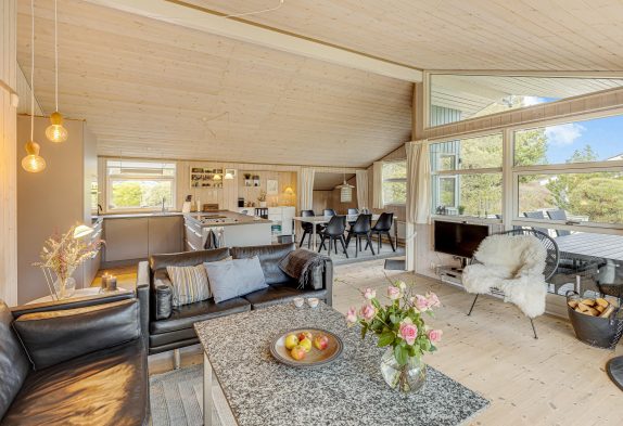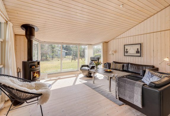 Ein herrlicher Blick ins Grüne, schöne Terrassenbereiche, Sandkasten und Schaukel für die kleinen Gäste sowie eine umfassende Ausstattung im Inneren inklusive Sauna und Whirlpool – das alles und noch einiges mehr bietet euch dieses Ferienhaus im Kirkeflod 22.
