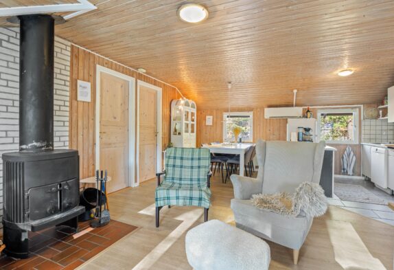 Das Wohnzimmer ist der Mittelpunkt des Ferienhauses, der mit seinem Kaminofen eine warme und gemütliche Atmosphäre bietet. Hier könnt ihr an kühleren Abenden entspannte Stunden verbringen, während das Knistern des Holzes im Ofen für wohlige Wärme sorgt. Die Sitzgelegenheiten laden zum Verweilen ein, sei es für gesellige Runden mit der Familie oder ruhige Abende bei einem guten Buch.