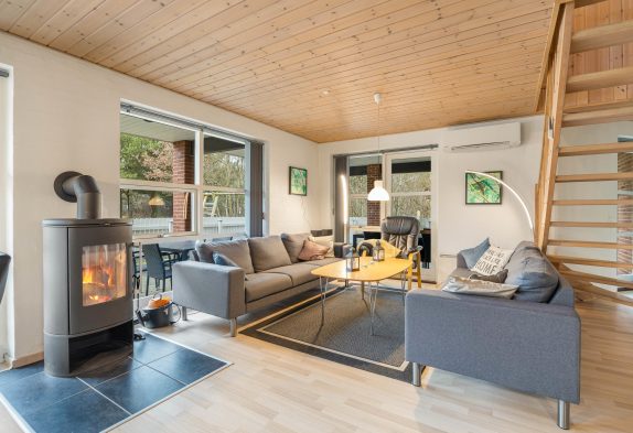 Durch die vielen Fenster scheint das Licht angenehm und freundlich in den hellen Wohnbereich im Erdgeschoss, in dem die Sofagruppe vor dem gut platzierten Kamin und Fernseher zum Verweilen und Aufladen der Batterien einlädt, während der Blick nach draussen schweift.