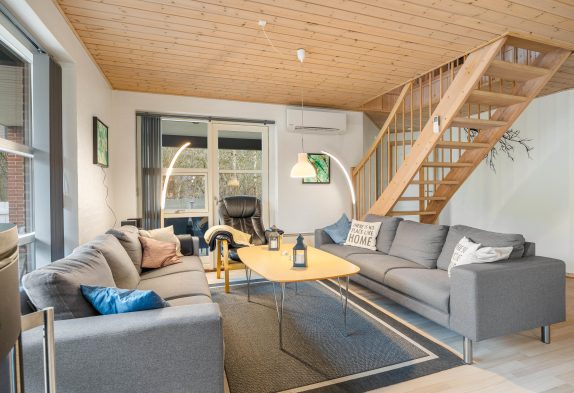 Ein weiteres, aber kleineres Wohnzimmer mit Fernseher, Sofa sowie Leseecke befindet sich im Obergeschoss, so dass in Ruhe ein Buch gelesen werden kann, während auf der anderen Etage TV geguckt, gespielt und sich unterhalten wird.