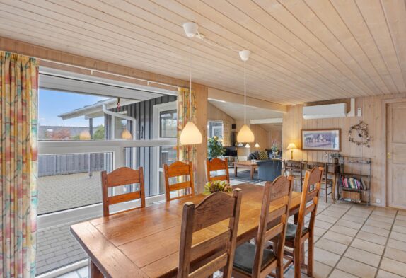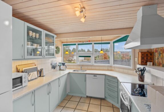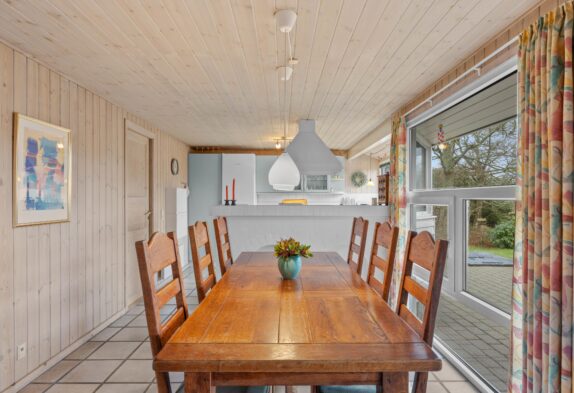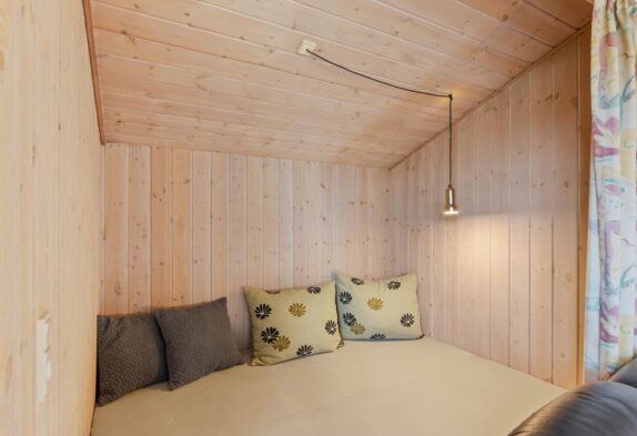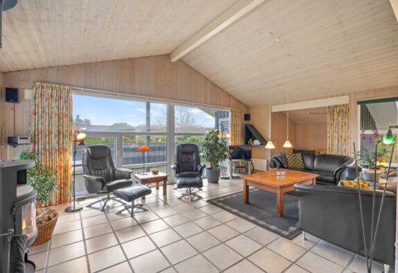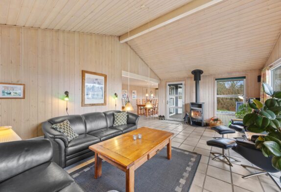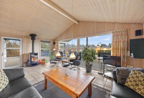 Der grosse helle Wohnbereich mit der offenen gut ausgestatteten Küche ist der Mittelpunkt dieses einladenden Ferienhauses. Hier könnt Ihr viele gemeinsame Stunden in gemütlicher Atmosphäre verbringen. Für das kleine Nickerchen zwischendurch könnt Ihr den gemütlichen Alkoven im Wohnraum nutzen. An etwas kühleren Tagen sorgt der knisternde Kaminofen für wohlige Wärme, während Ihr von den bequemen Wohnzimmermöbeln aus, durch die grossen Panoramafenster, den Blick auf das herrliche Grundstück geniessen könnt.