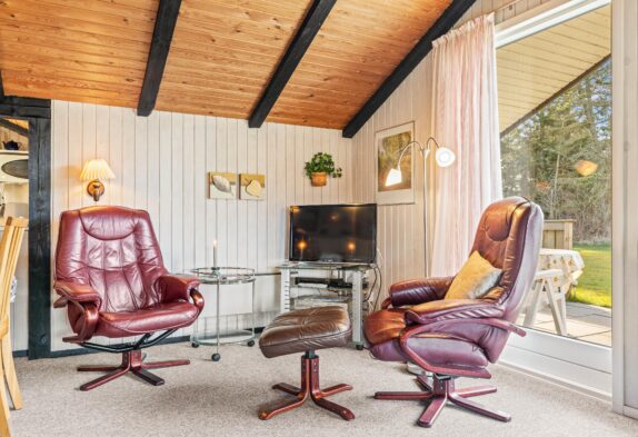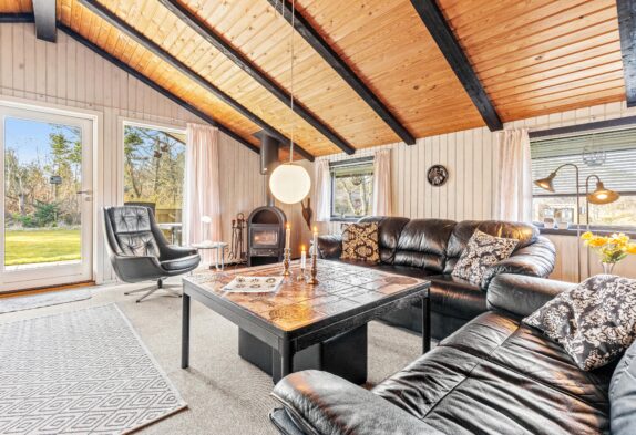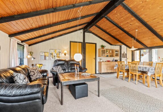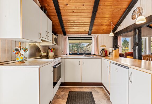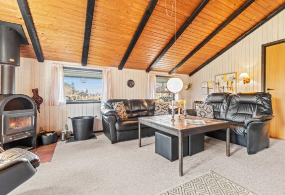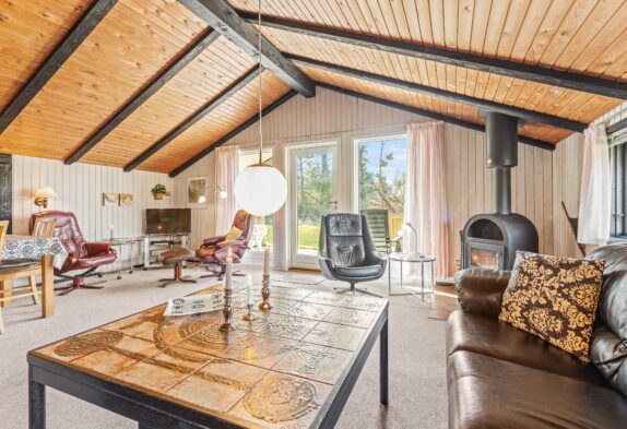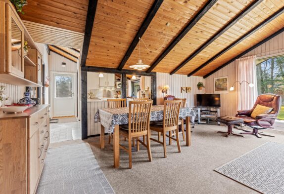 Der gemütliche Wohnraum mit der halboffenen Küche ist der Mittelpunkt des Hauses. Hier kann sich die ganze Familie vor dem knisternden Kaminofen versammeln und die wohlige Wärme geniessen. Die dunkleren sichtbaren Balken sorgen für eine typisch dänische Sommerhausstimmung.