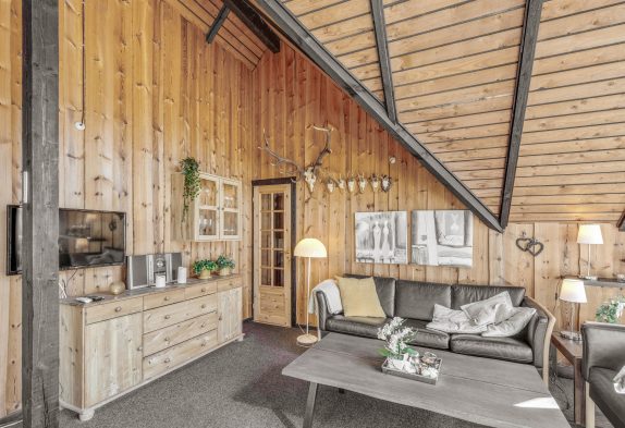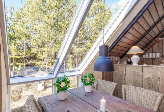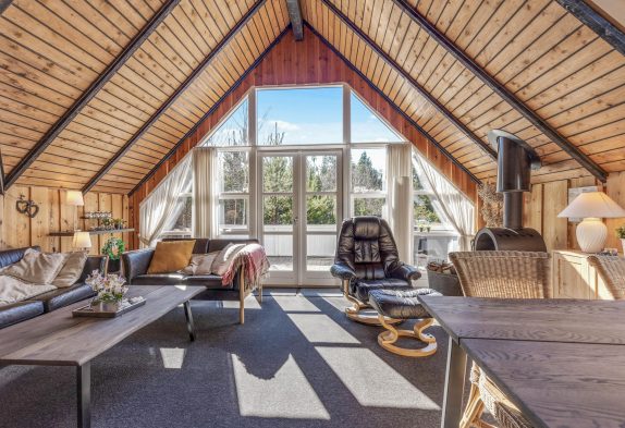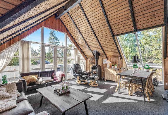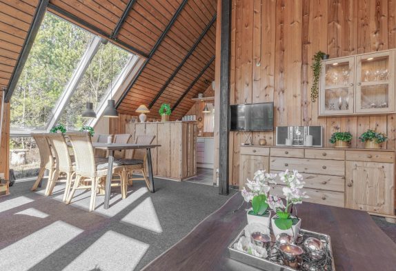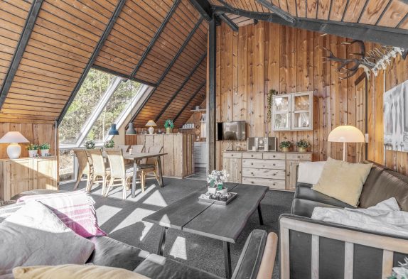 Das Herzstück dieses typisch dänischen Holzhauses mit Reetdach bildet der offene Wohn- und Essbereich, der ebenfalls den einzigartigen Hüttencharme versprüht.