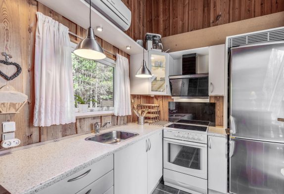 Grosse Dachfenster und eine tolle Fensterfront geben den Blick auf die umliegende Natur frei und sorgen für viel Helligkeit im Innenraum. Hier könnt ihr in der offenen Küche gemeinsam kochen und es euch anschliessend mit einem Buch vor dem knisternden Kaminofen gemütlich machen, während der Geschirrspüler den Abwasch übernimmt.