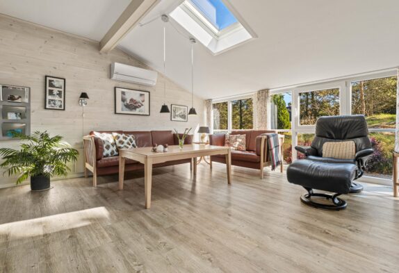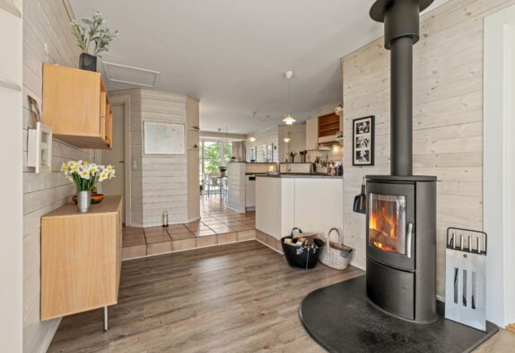 Das Herzstück dieses Hauses bildet der Anbau, mit dem der offen gestaltete Wohn- Essbereich 2010 um ein tolles helles Wohnzimmer erweitert wurde. Ähnlich wie in einem Wintergarten spenden zahlreiche Fenster viel Licht und ihr könnt euren Blick vom Sofa aus über die wundervolle Natur schweifen lassen. Während ihr es euch besonders an kalten Tagen mit einem Buch hier gemütlich macht, sorgt der Kaminofen mit einem knisternden Feuer für eine gemütliche Wärme.