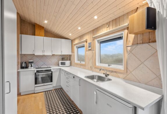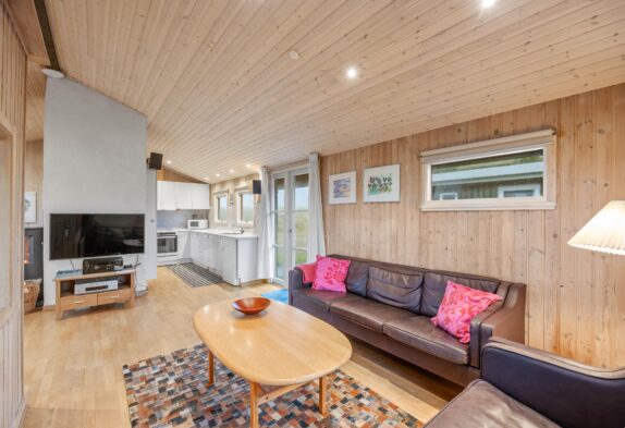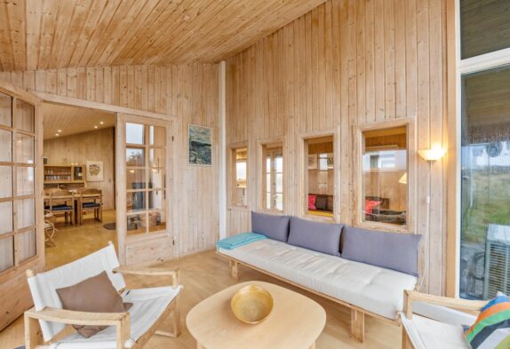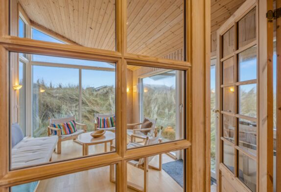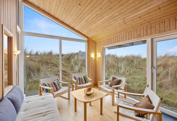 Wo genau? In der Tat, hier habt ihr in den mit viel Holz gestalteten Räumlichkeiten die Qual der Wahl. Lasst euch buchstäblich in die Behaglichkeit der Sofazone fallen – Fernseher, DVD-Player vorhanden! – oder rückt ein Stück näher an die Dünen heran, nämlich im wintergartenähnlichen zweiten Wohnbereich, der euch Dank der großen Fenster fast vergessen lässt, dass ihr euch nicht Open Air unter dem Nordseehimmel befindet.