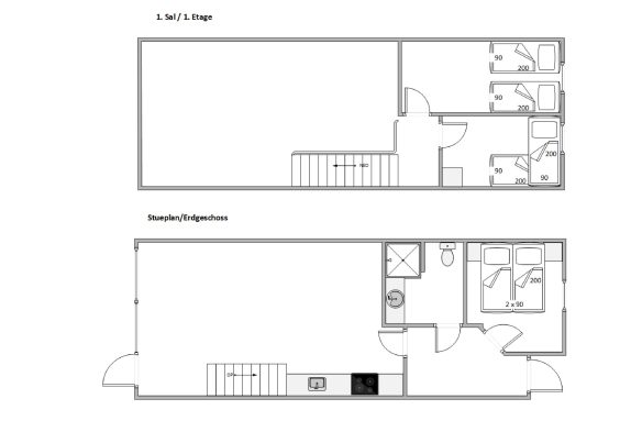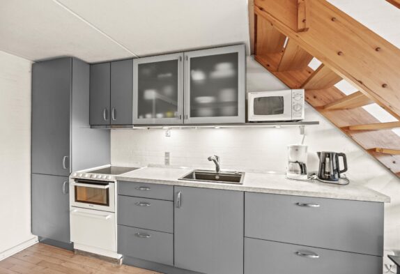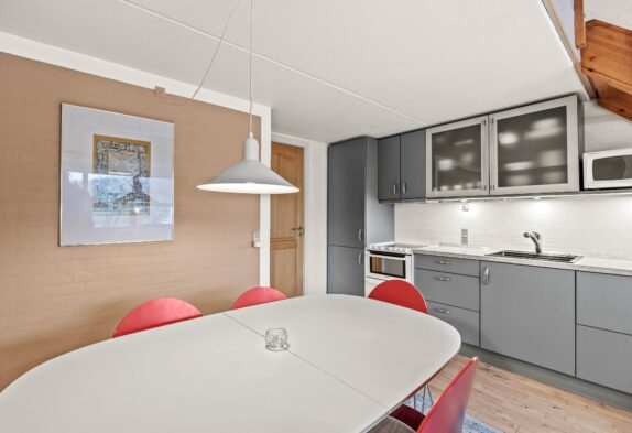 Der gemütliche Wohnraum mit der integrierten Küche lädt zu vielen schönen gemeinsamen Ferienstunden ein. Die kleine Küchenzeile ist mit allem ausgestattet, was Ihr zum Zubereiten leckerer Mahlzeiten benötigt. Die Wohnung erstreckt sich über zwei Etagen, die durch eine im Wohnraum befindliche Treppe miteinander verbunden sind. Oben befinden sich 2 Schlafzimmer, das dritte ist unten.