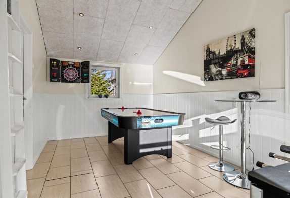 Das große Badezimmer verfügt sowohl über Whirlpool als auch Sauna, die zum Entspannen einladen. Hier könnt ihr den Alltagsstress hinter euch lassen. Zündet vielleicht ein paar Kerzen an und lehnt Euch zurück, während sich die Kinder im grossen Aktivitätsraum vergnügen. Im Aktivitätsraum stehen sowohl ein Tischfußball, Airhockey und ein Flachbildschirm bereit, sodass reichlich Möglichkeiten für Unterhaltung geboten sind. Nicht nur für Kinder ist dieser Raum interessant auch für alle Junggebliebenen. Da ist doch sicher Zeit für ein kleines Match.