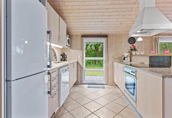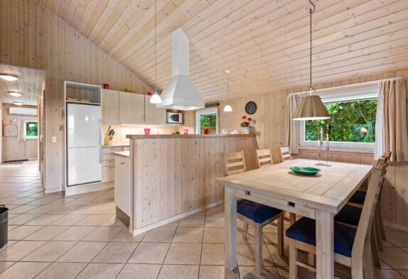 Das einladende Wohnzimmer ist ideal für entspannte Stunden mit der Familie oder Freunden. Der Kaminofen verbreitet an kühleren Tagen eine behagliche Wärme und schafft eine gemütliche Atmosphäre. Für zusätzlichen Komfort sorgt die Luft-zu-Luft-Wärmepumpe, die das gesamte Ferienhaus das ganze Jahr über angenehm temperiert. Hier könnt ihr es euch mit einem guten Buch oder einem spannenden Film gemütlich machen und erholsame Abende genießen. Die modern ausgestattete Küche lässt keine Wünsche offen. Eine Spülmaschine erleichtert euch den Abwasch und der angrenzende Essbereich bietet ausreichend Platz für alle, um gemeinsam zu Essen.