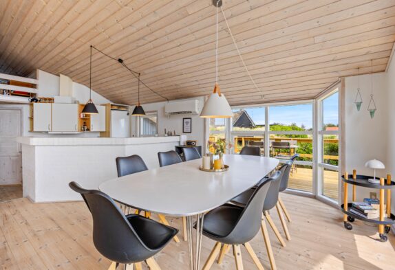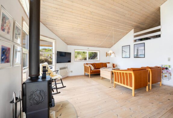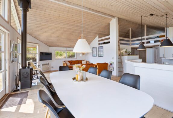 Der große Aufenthaltsraum mit Wohnzimmer, Küche und Essbereich in einem, bietet viel gemütlichen Raum für die gesamte Familie. Mit dem Hems, dem Kamin und den großen Fensterfronten wird der Raum noch ansprechender. Im Mittelpunkt steht der klassische Holzofen, der das ganze Jahr über für eine warme und schöne Urlaubsatmosphäre sorgt.